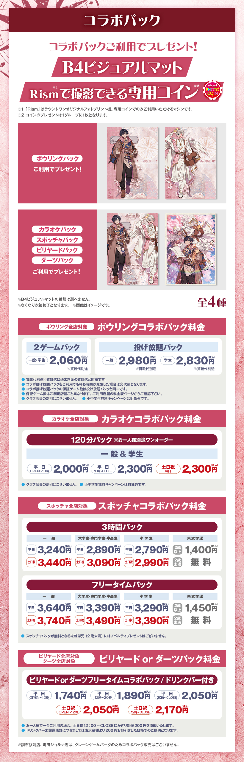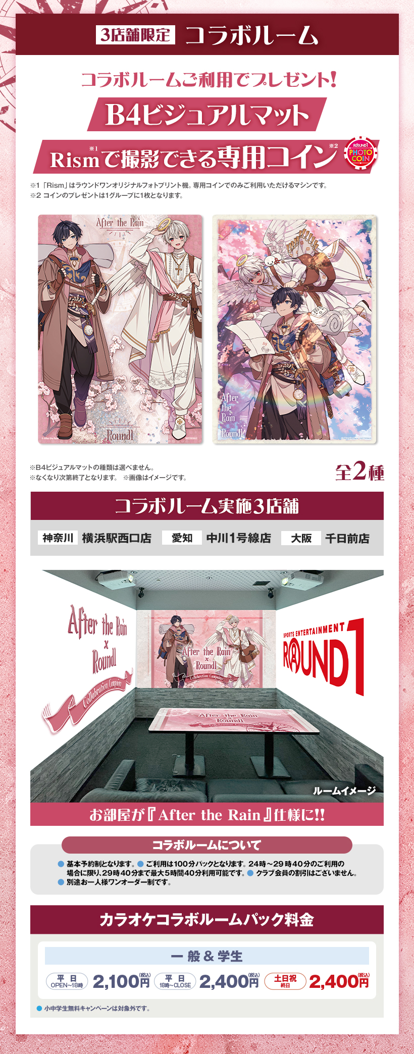 ※原則予約制となります。WEB・アプリからご予約いただけます。 ※クラブ会員等の割引はございません。 ※スペシャルコラボルームは原則予約制となります。ご予約がない時間帯はご利用いただけますが、次のご予約利用の方の時間までとなります。