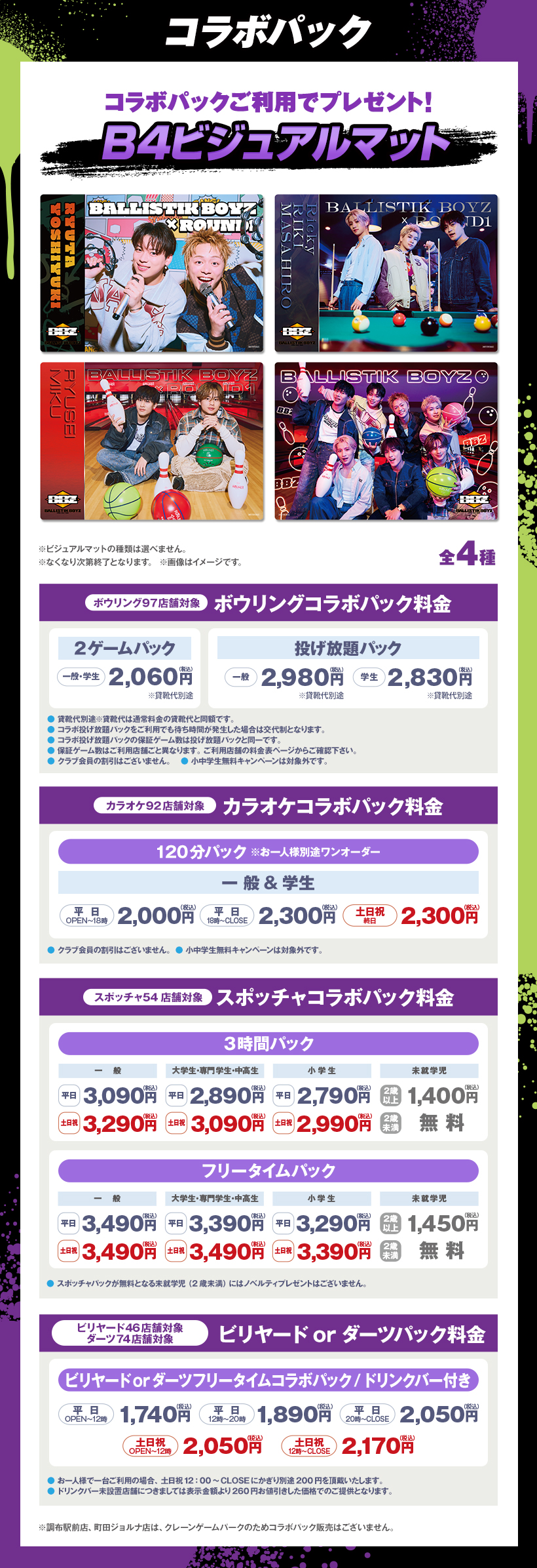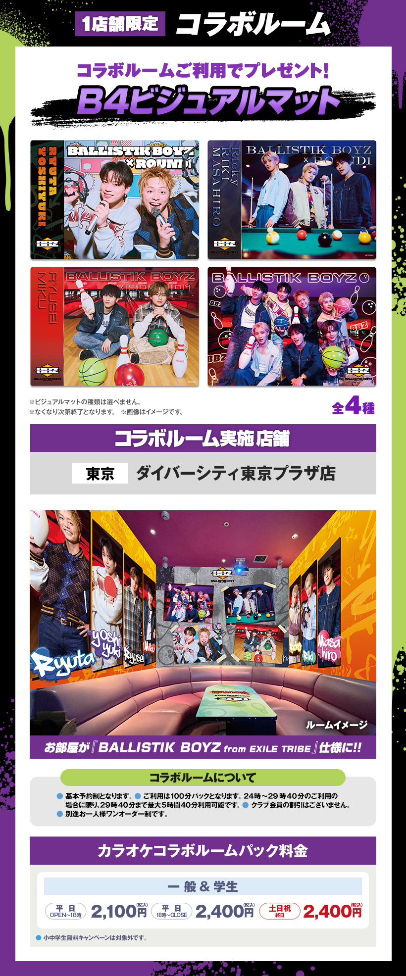 ※原則予約制となります。WEB・アプリからご予約いただけます。 ※クラブ会員等の割引はございません。 ※スペシャルコラボルームは原則予約制となります。ご予約がない時間帯はご利用いただけますが、次のご予約利用の方の時間までとなります。