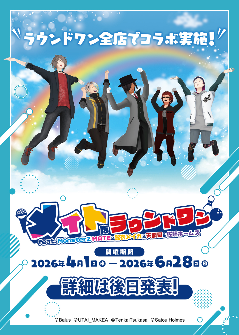 「メイトなラウンドワン」feat.MonsterZ MATE&歌衣メイカ&天開司&佐藤ホームズ コラボキャンペーン開催!