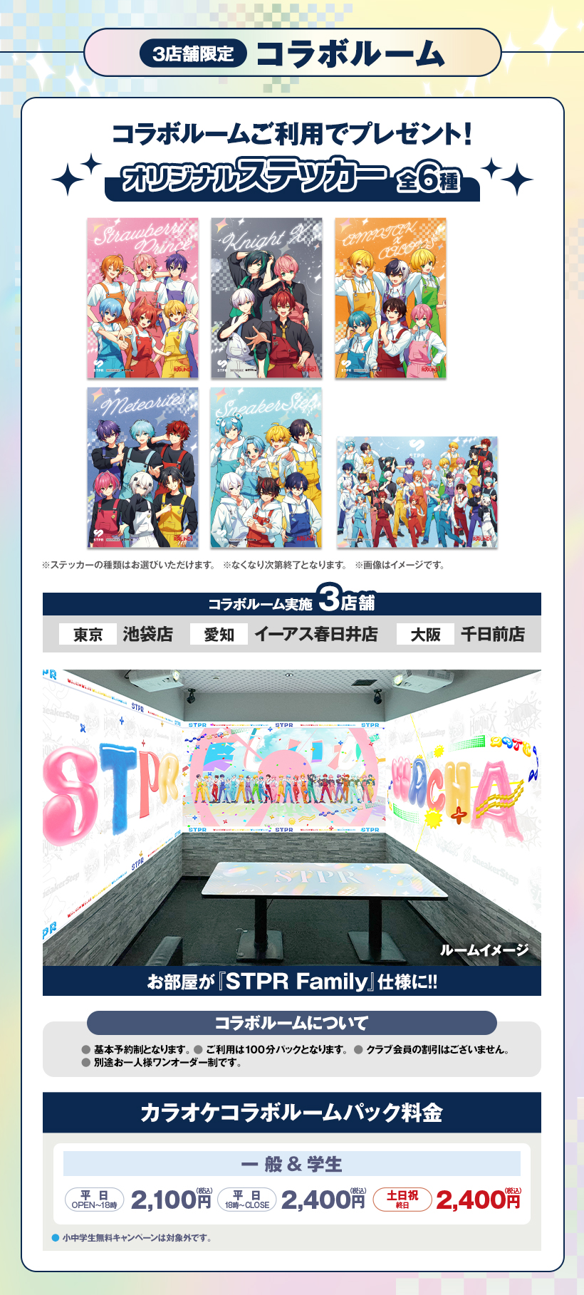 ※原則予約制となります。WEB・アプリからご予約いただけます。 ※学生割引やクラブ会員等の割引はございません。 ※スペシャルコラボルームは原則予約制となります。ご予約がない時間帯はご利用いただけますが、次のご予約利用の方の時間までとなります。