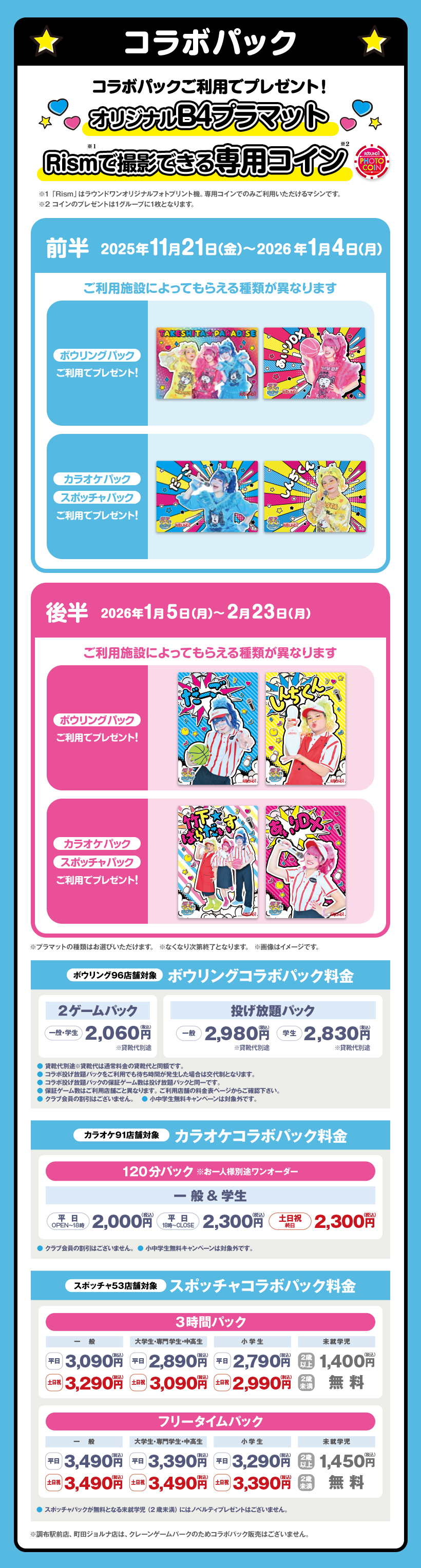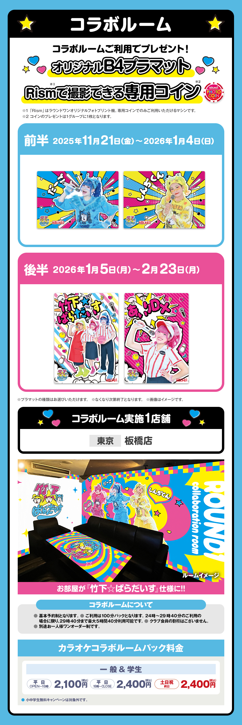 ※原則予約制となります。WEB・アプリからご予約いただけます。 ※クラブ会員等の割引はございません。 ※スペシャルコラボルームは原則予約制となります。ご予約がない時間帯はご利用いただけますが、次のご予約利用の方の時間までとなります。
