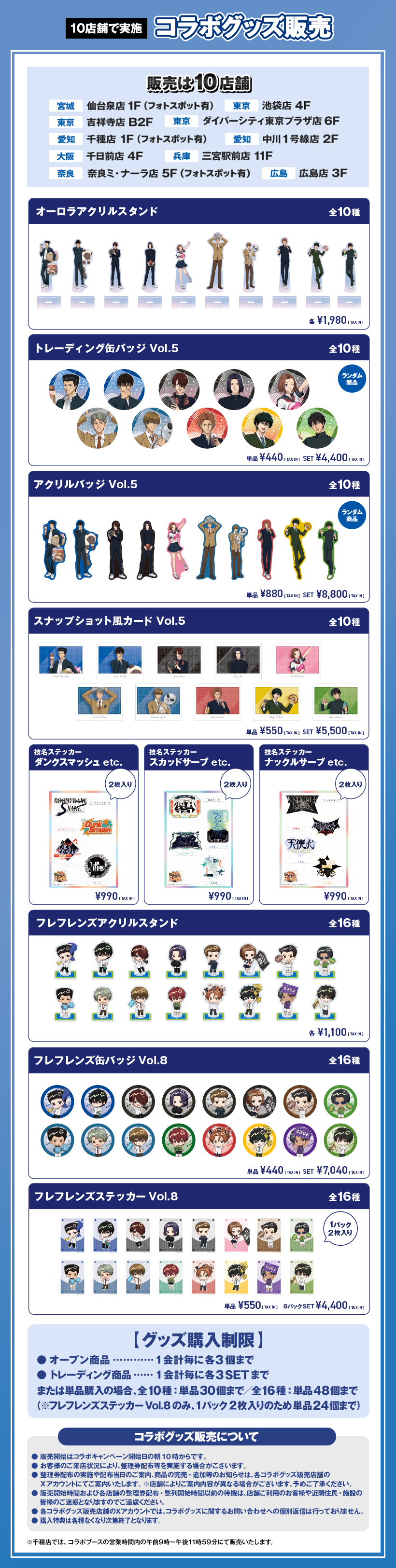 ※各グッズ、ノベルティ及び、ルーム予約においての、転売目的、営利目的の予約、ご購入は固くお断りいたします。 ※店舗および商品により、 ご用意している数量が異なります。店舗在庫が無い場合は、購入制限の3個に関わらず、在庫分のみの購入となります事を事前にご了承ください。