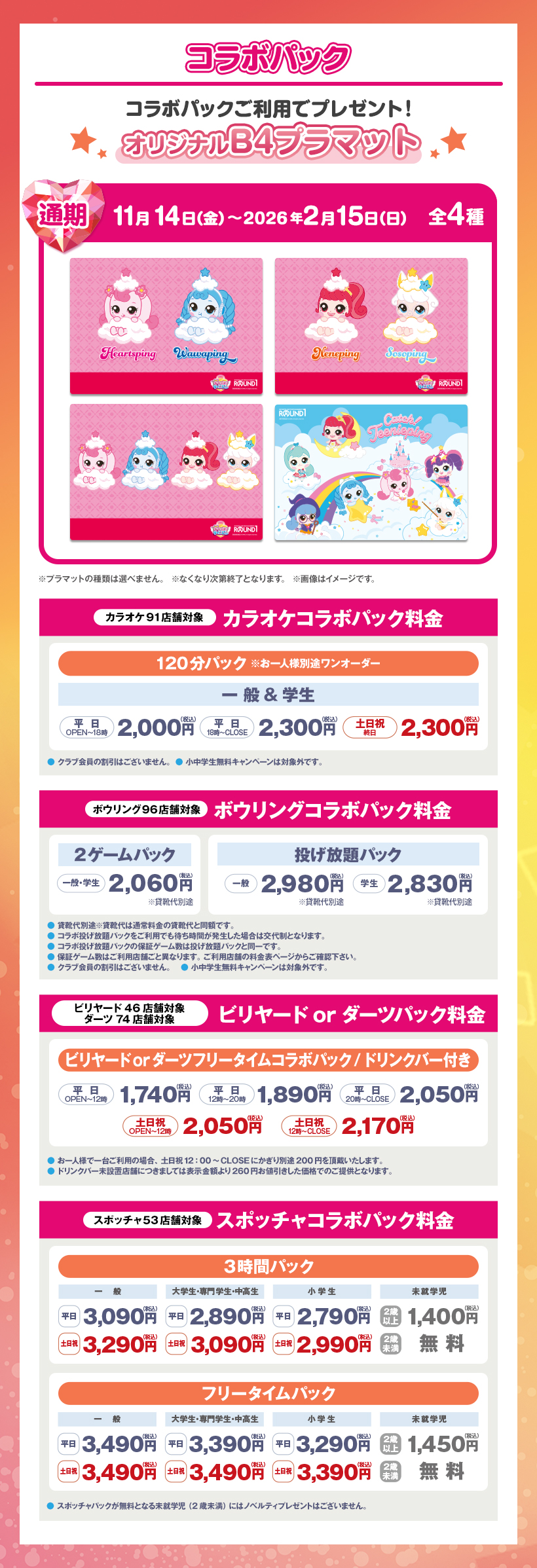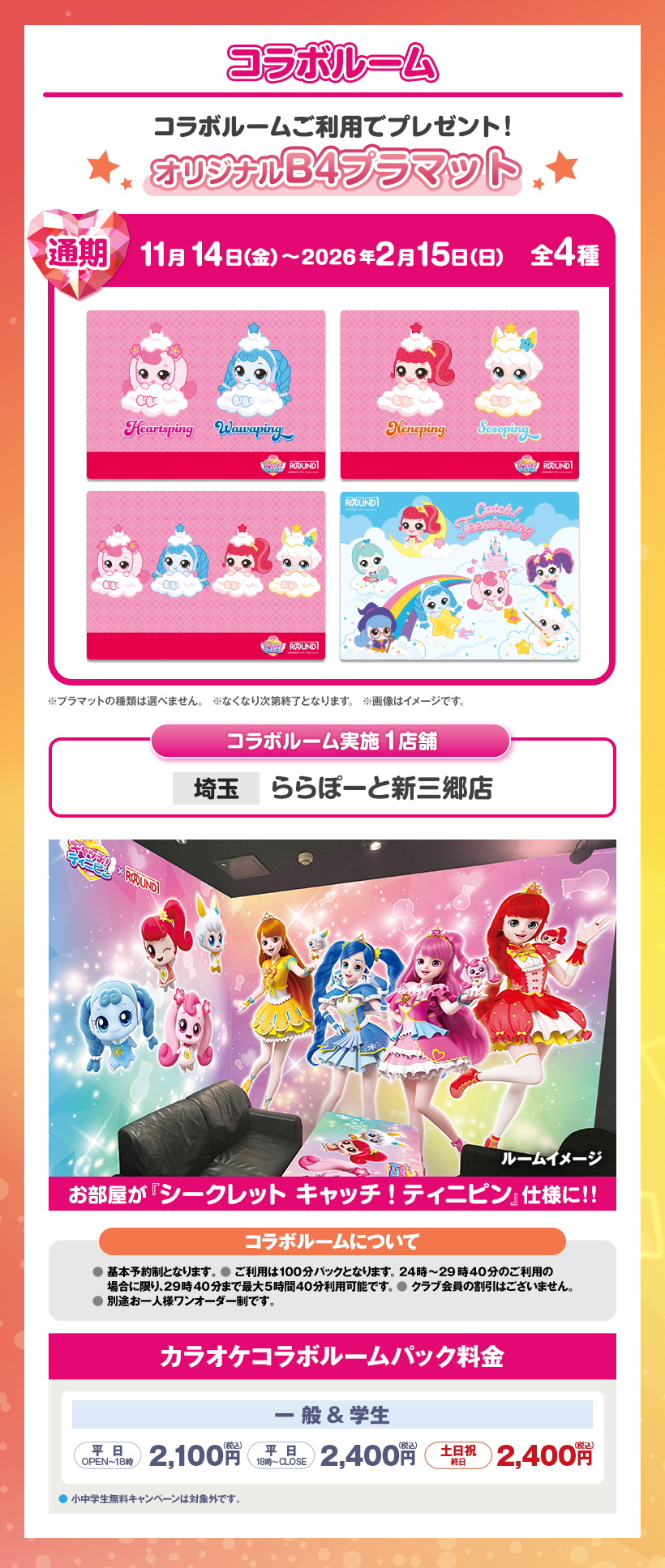 ※原則予約制となります。WEB・アプリからご予約いただけます。 ※クラブ会員等の割引はございません。 ※スペシャルコラボルームは原則予約制となります。ご予約がない時間帯はご利用いただけますが、次のご予約利用の方の時間までとなります。