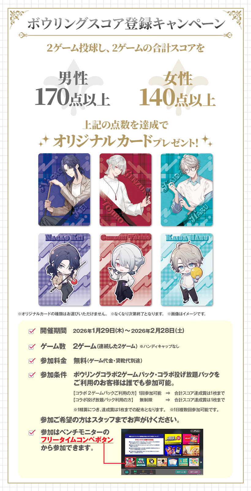 例えば「ボウリングコラボ2ゲームパック」をご利用の場合、一度ご精算を頂いてから新たに「ボウリングコラボ2ゲームパック」をご利用頂くことにより、さらにB4プラマット1枚お渡しさせて頂いております。