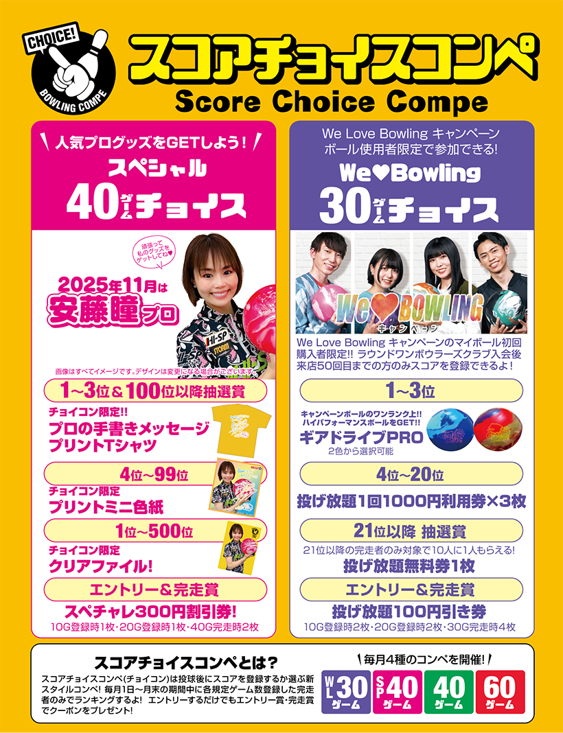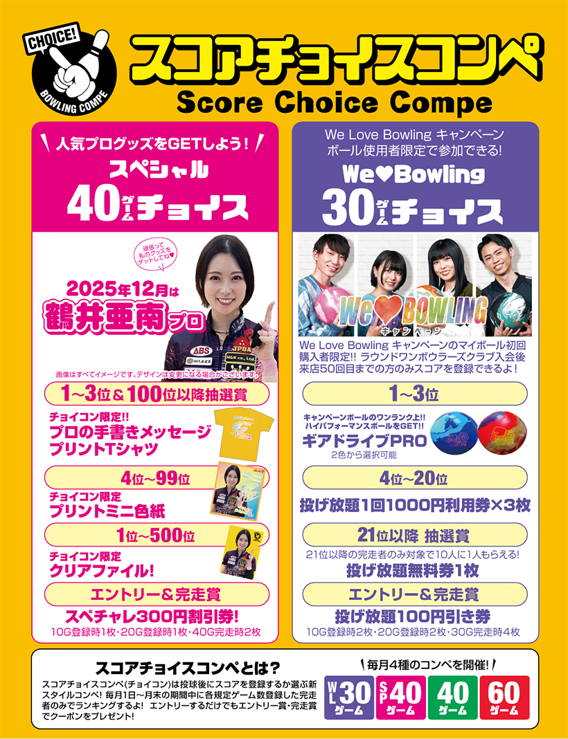※スコア修正が1ゲームにつき3回以上行われた場合や弊社にて正当なスコアではないと判断した場合、該当スコアの削除を行う場合があります。 ※不正な投球、スコア改ざんなどスポーツマンシップに反する行為は固く禁止いたします。 ※弊社がルール違反行為また禁止行為と判断した場合は参加の拒否や全ての情報の削除、権利の抹消を行うことがあります。 ※正当ではないと判断したスコアの削除は予告なく行わせていただきます。またその際に個別のお問い合わせには一切お答えできませんのでご注意ください。 ※お客様の都合、手順の間違い、システムの不具合等理由の如何を問わず1度登録されたスコアの修正、ポイントの変更は一切行いません。同様に理由の如何を問わずスコア登録ができない事象が発生した場合も後からのスコア登録は行いません。予めご了承の上ご利用ください。 ※スコアの修正は、必ずスタッフをお呼び下さい。お客様自身でスコアの修正が発覚した場合、そのコンペのスコアは無効となります。 ※性別虚偽(男性が女性として投球等)、年齢虚偽、一つのIDを複数名で共有すること、不正なスコア修正をする等は全て不正行為として禁止させて頂きます。 万一、不正行為が発覚または弊社不正行為と認定した場合、スコア削除やID停止等厳しい措置を取らせて頂きます。 また、その際の個別の抗議やお問い合わせは一切受付致しません。 公正に皆様がお楽しみ頂けるための措置としてご理解頂けますようお願い申し上げます。 ※本サービスは2016年9月現在のものです。予告なく変更する場合があります。