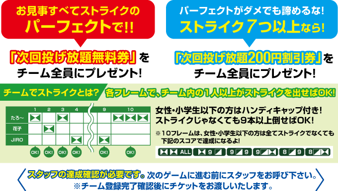 チームでパーフェクトを達成すると次回投げ放題無料券をチーム全員にその場でプレゼント!