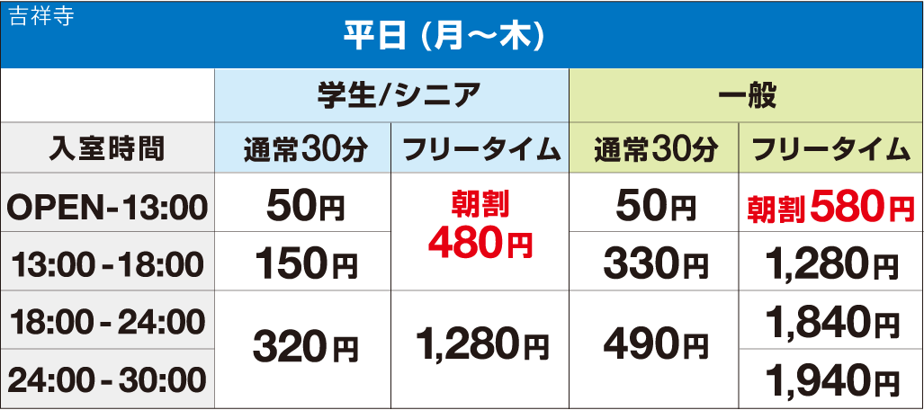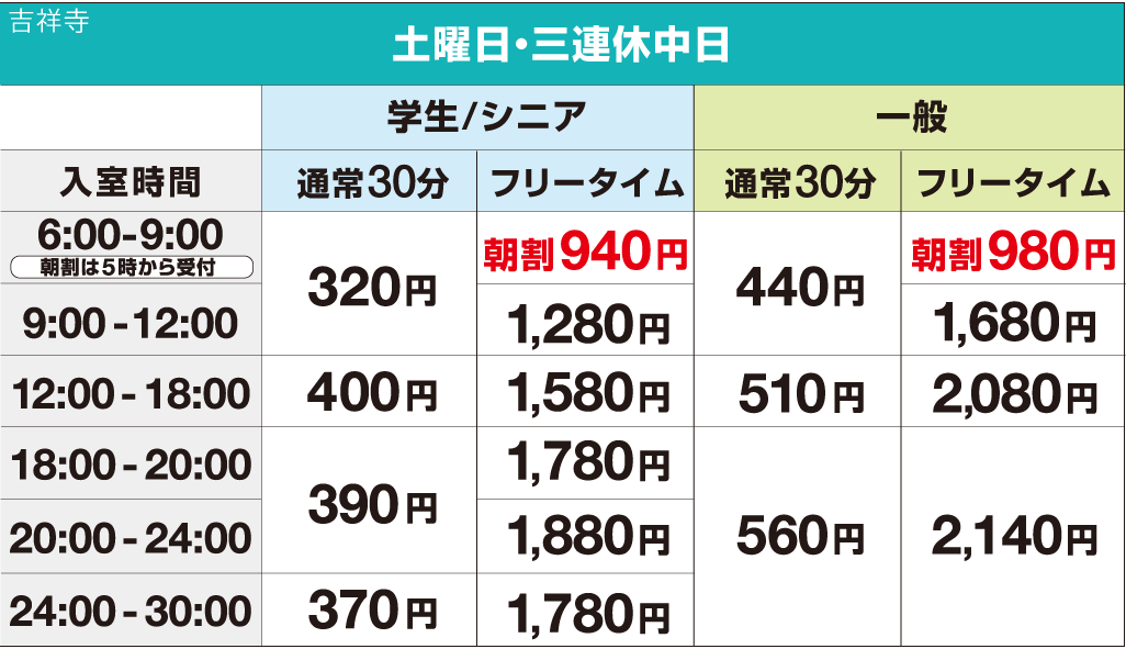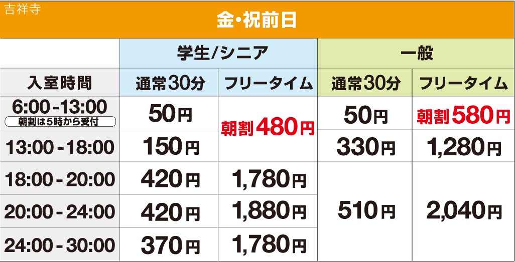 ※学生(高校生以上)・シニア(60歳以上)の方は年齢確認できる公的身分証明書のご提示が必要です。年齢により、ご入場・ご利用いただける時間が異なります。入場制限になった場合、ご利用途中であっても終了となります。※自動精算システムとなりますので、入室・各延長毎のスタート時間を基準に料金が決まります。※朝割は、待ち時間等でスタート時間が過ぎた場合、ご利用いただけませんのでお早めに受付をお願い致します。※障害者手帳をお持ちの方は受付時に手帳等をスタッフへご提示ください。ご本人様+付添いの方2名様までプラチナ会員と同額の割引が適用となります。※GW、お盆、年末年始等の特別営業期間は、料金・ご利用時間等内容が変更になる場合がございます。※赤字料金のフリータイムは割引クーポンとの併用はできません。