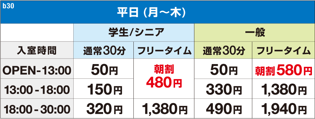 ●30分 : クラブ会員50円引、シルバー会員60円引、ゴールド会員70円引、プラチナ会員80円引となります。●フリータイム:クラブ会員150円引