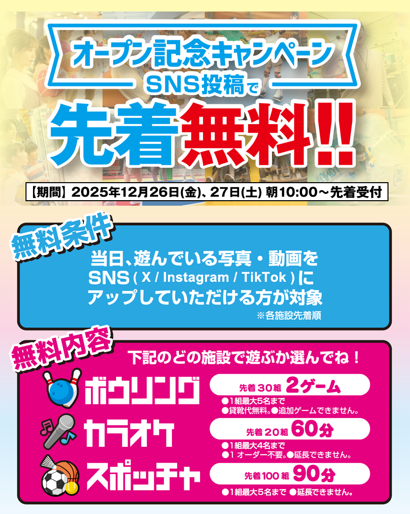 ※ラウンドワン公式または店舗より、リポストなどをさせていただく場合がございます。ご了承ください。 ※SNSへの投稿が確認できない場合、ご利用料金は有料となりますのでご注意ください。
